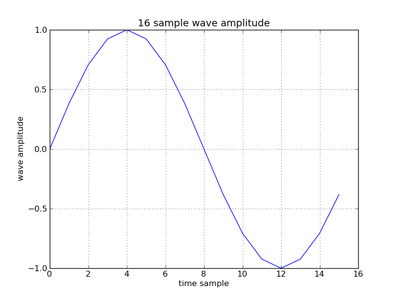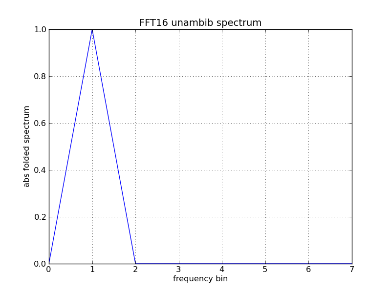 sixteen point input of one cycle unambiguous spectrum, half as many values a=cx[i].real+cx[nfft-i].real b=cx[i].imag-cx[nfft-i].imag v=sqrt(a*a+b*b)/nfft