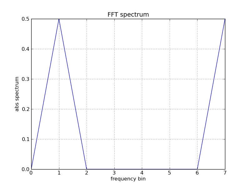 eight point input of one cycle unambiguous spectrum, half as many values a=cx[i].real+cx[nfft-i].real b=cx[i].imag-cx[nfft-i].imag v=sqrt(a*a+b*b)/nfft