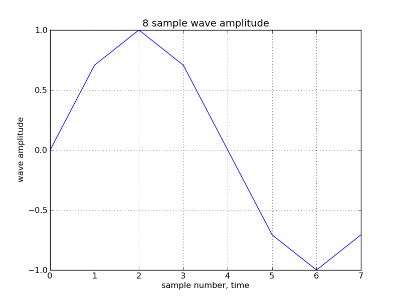 Plots generated by plot_fft.py Printout from plot_fft_py.outeight sample input of one cycle amplitude of signal