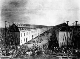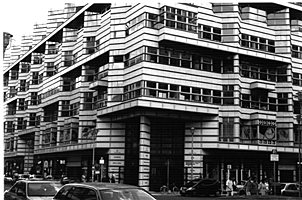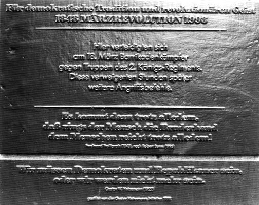 FriedrichStraße at JagerStraße, 1865.When Bismark united Germany in 1871, the government initiated the development of this street which eventually became one of the most daring, elite, cafe, cabaret, and hotel neighborhood streets in the world. However it was almost completely bombed during WWII, and because it paralleled the wall on the East during the cold war, it was left desolate as "the end of the world", at least the communist world. While efforts began to build on this empty lot in the 1980's, it wouldn't be until the American architect Henry Cobb built Quartier 206, a posh mall which stands today on the entire block with the address 71 FriedrichStraße. Accross the street is a plaque commemorating the barricade of the 1848 Revolution.