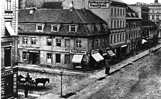 This image below is taken at the corner of the FriedrichStraße and JagerStraße looking south toward TaubenStraße in 1865 (accross from a Polish Apothecary). A furier occupies the FranzFränke tall building, and a glass and porcelain shop is on JagerStraße. The two end buildings are original homes built by the Soldier King, the latter being 71 FriedrichStraße. Both corner buildings have a storefront. The end corner of FriedrichStraße and TaubenStraße is where the barracade of 1848 tipped over an applecart and two young craftsmen (boys) lost their lives to the batallion (pos. Frankfurt a/Oder) during the last hours of the revolution. It's this corner store that may house a jewelry business along with the young Friederici couple.