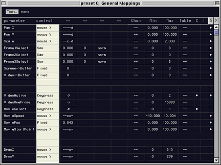 The Control column (highlighted in white) allows you to set the type of input device you want to trigger effects such as MovieSpeed; or alternatively offer fixed and continuous commands. Types of control input devices to choose from include Midi, keyboard, mouse, L/R audio (from CD, Mic, etc.). For instance: Do you want a keyboard command or a midi device to control the MovieSpeed?