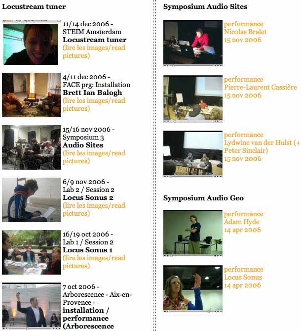 They explore and evaluate the innovative and transdisciplinary nature of audio art forms in a lab context. A concern for the communal, collective or multi-user aspects of audio art is central to the practice of Locus Sonus. Two main themes define this research: audio in it's relation to space, and networked audio systems. |