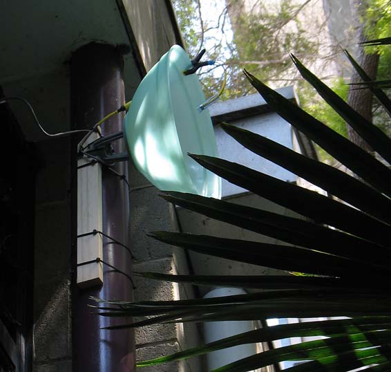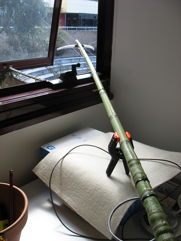 The first version of the installation featured a binaural microphone lashed to a 1.5-meter pole. After moving to a new office, I bulit a parabolic microphone to focus on the insect and bird sounds I heard in the secluded garden courtyard that I face. An op-shop kitchen bowl scoops sound to a monaural electret condenser microphone, that is routed through a PureData patch.
